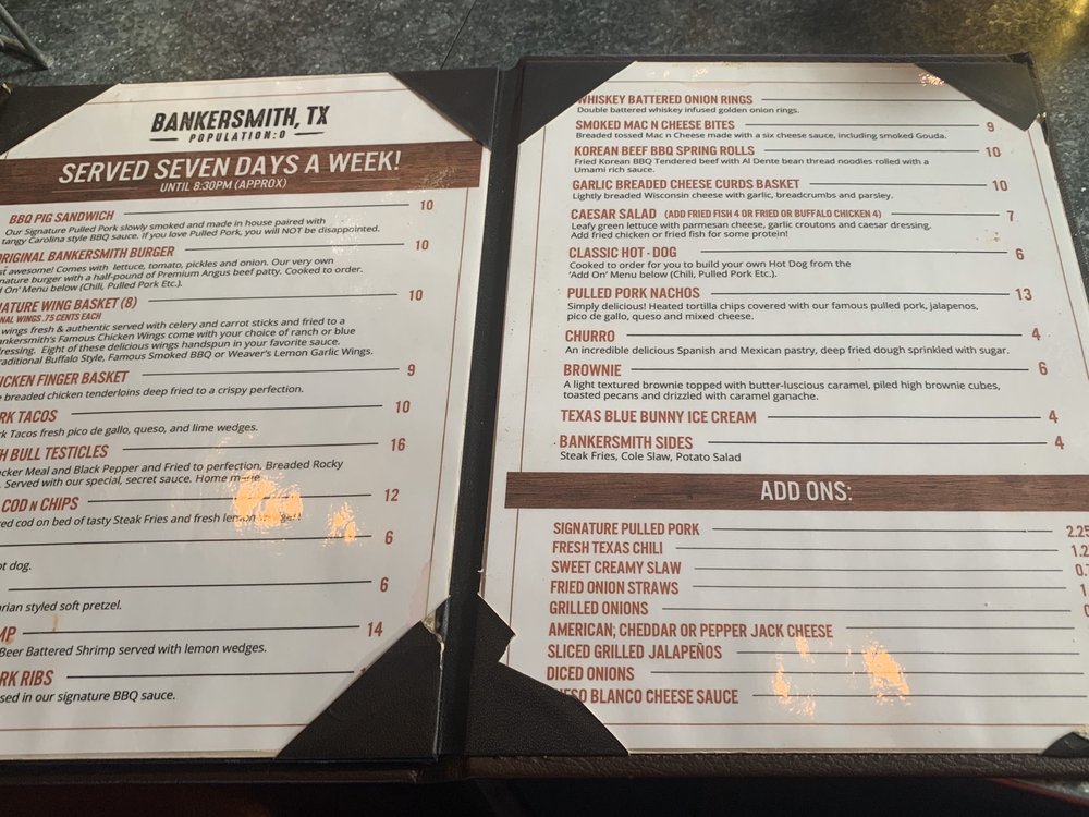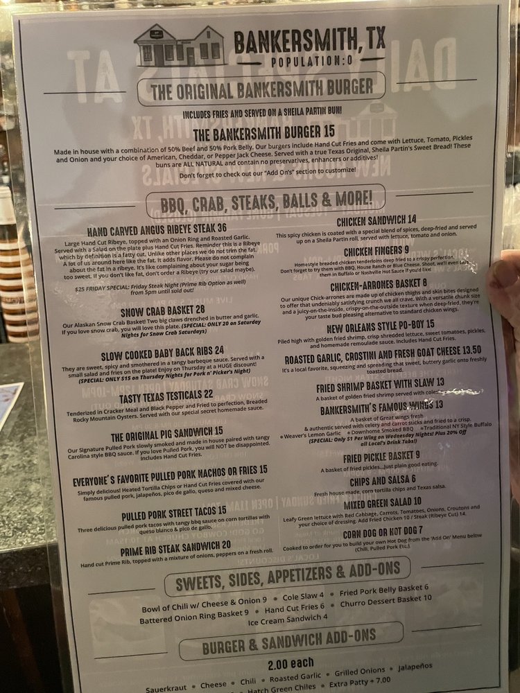 Bankersmith is a dive bar and bbq joint located in Fredericksburg, TX, offering a unique mix of American cuisine. The menu boasts many vegetarian options and includes crowd favorites like fish & chips, poutine, prime rib, and loaded baked potato. The atmosphere is divey and casual, with live music, happy hour specials, and a welcoming outdoor seating area with a fire pit. Customers rave about the relaxed yet lively vibe, friendly staff, and dog-friendly environment. Bankersmith is also known for hosting special events like steak, cigar, and whiskey festivals. With a diverse range of amenities including drive-thru service, outdoor games, and a veteran-owned establishment, Bankersmith is a must-visit for those seeking a rustic dining experience with a touch of charm.